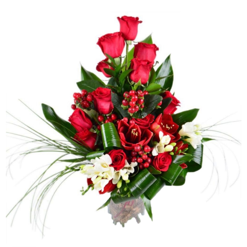 Букет состоит из 13 роз, 1 амариллис, 3 ветки альстромерии, 4 гиперикума, аспидистра, зелень, прозрачная упаковка, атласная лента.