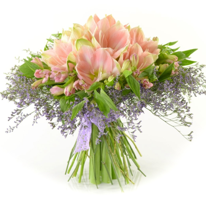 Букет состоит из 6 амариллисов, 12 веток альстромерий, 9 лимониум, прозрачная упаковка, атласная лента.