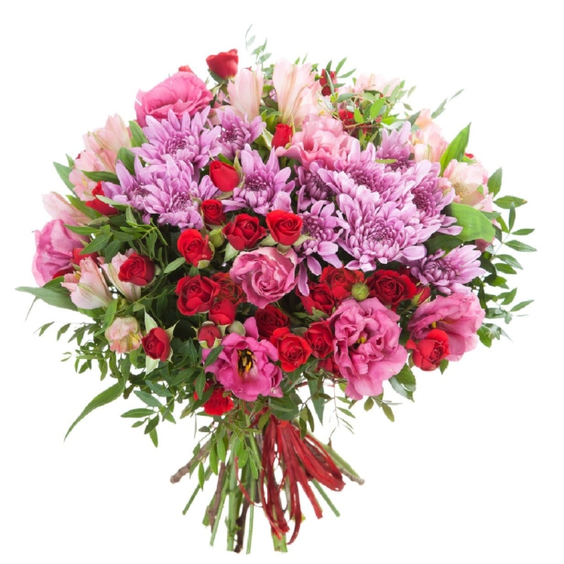 Букет состоит из 5 кустовых роз, 4 эустомы, 5 альстромерий, 3 ветки хризантемы, зелень, прозрачная упаковка, атласная лента.