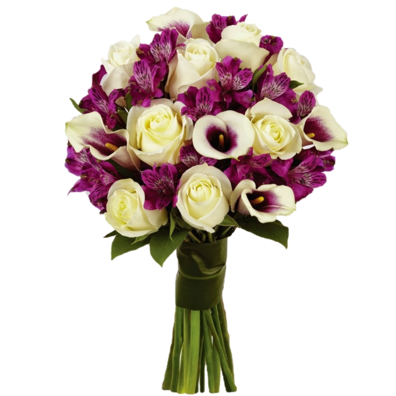 Букет состоит из 7 роз, 5 калл, 7 альстромерий, прозрачная упаковка, атласная лента.