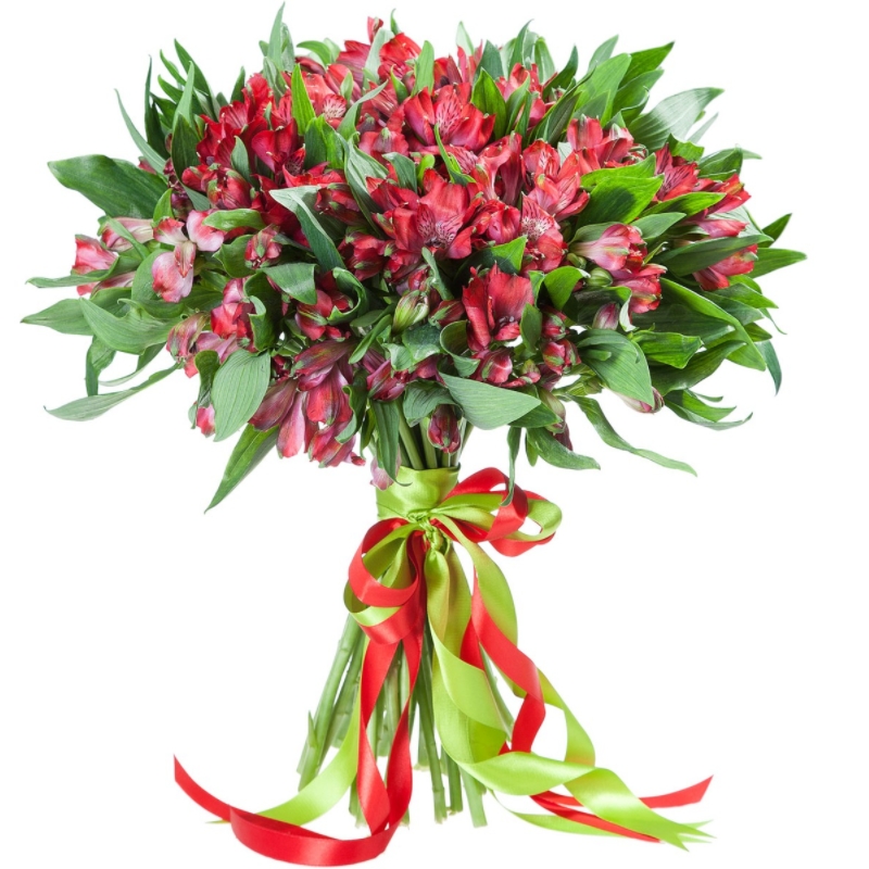 Букет состоит из 19 красных альстромерий, зелень, прозрачная упаковка, атласная лента.