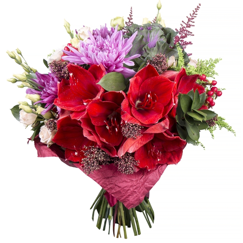 Букет состоит из 3 амариллиса, 3 хризантемы, 2 ветки эустомы, 2 брассики фиолетовые, 2 ветки гиперикума, 2 ветки кустовой розы, 3 солидаго, 5 скиммия, 7 астильба, зелень, крафт, атласная лента.