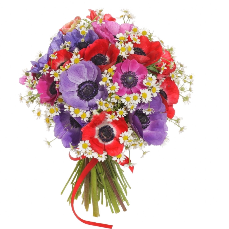 Букет состоит из MIX из 21 анемона, 6 веток танацетума, прозрачная упаковка, атласная лента.