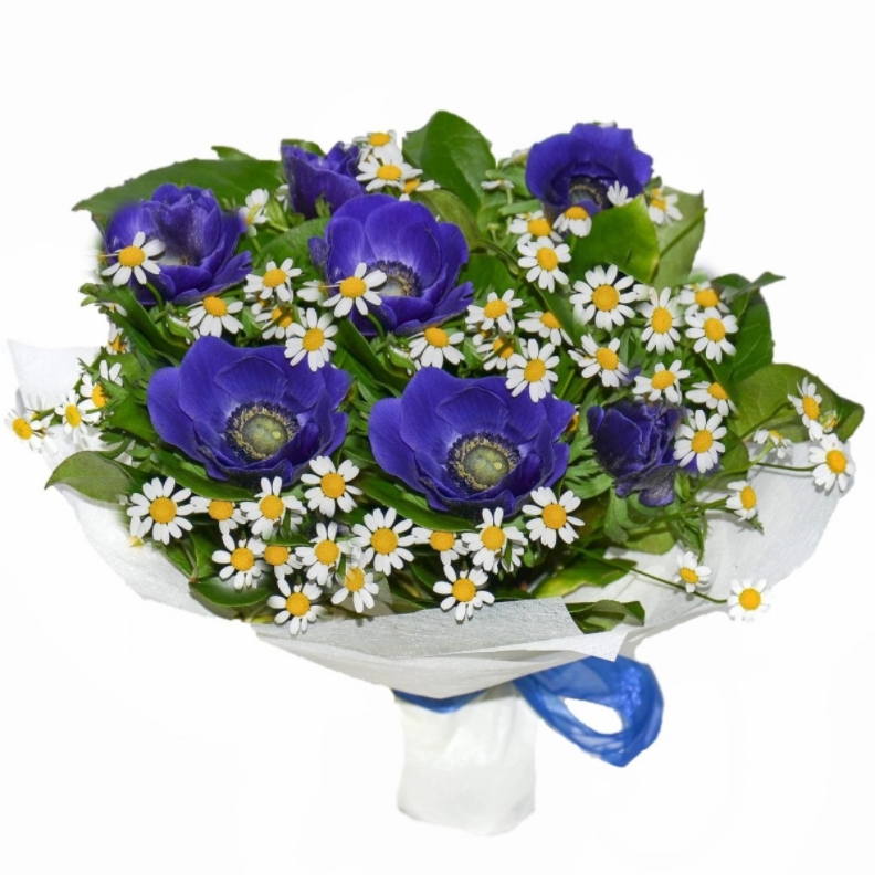 Букет состоит из 7 анемонов, 6 веток танацетума, зелень, красивая упаковка, атласная лента.