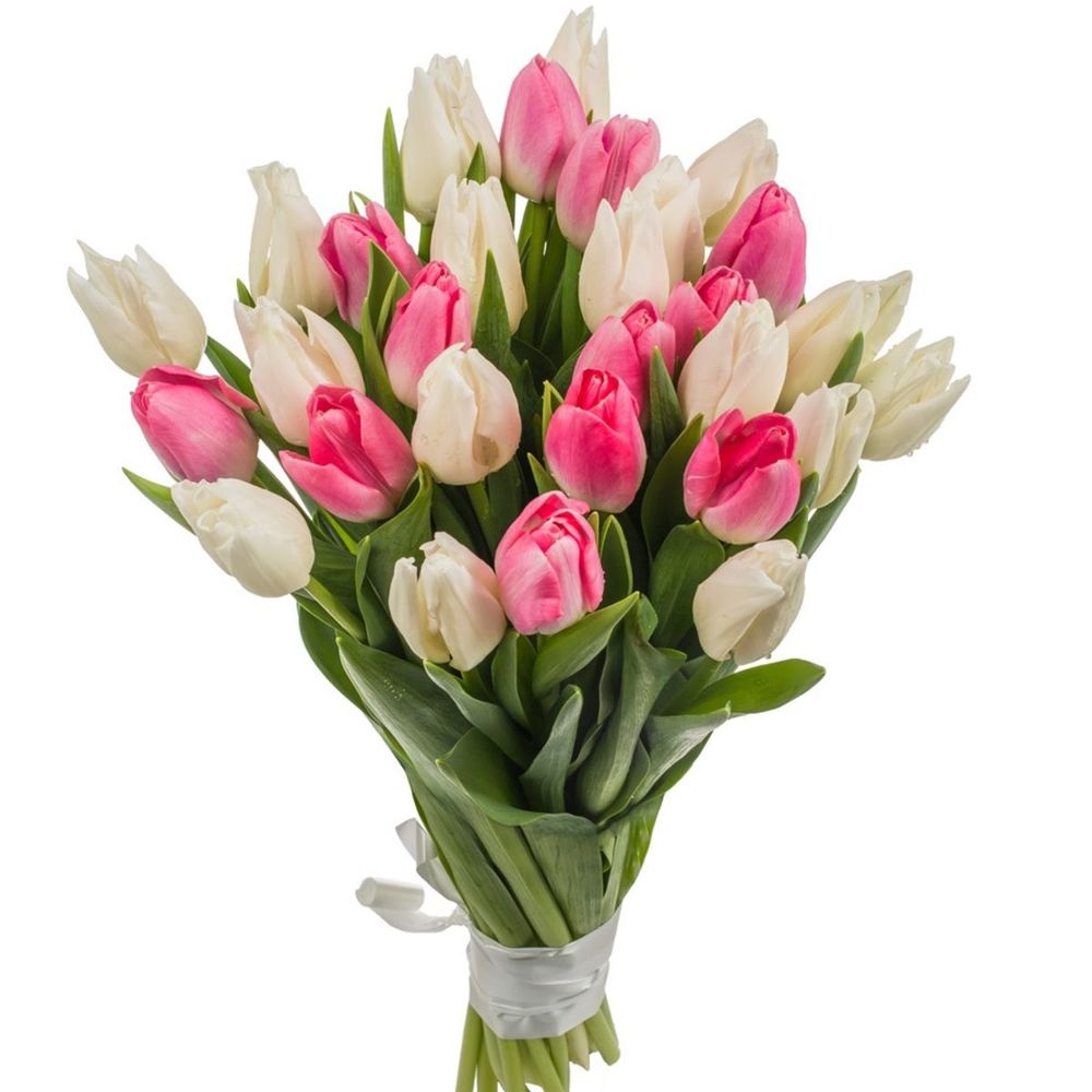 Букет из 25 белых и розовых тюльпанов