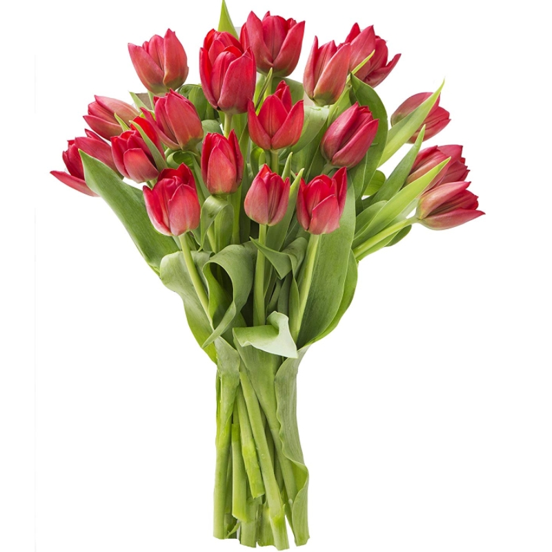 Букет состоит из 25 красных тюльпанов, прозрачная упаковка, атласная лента.