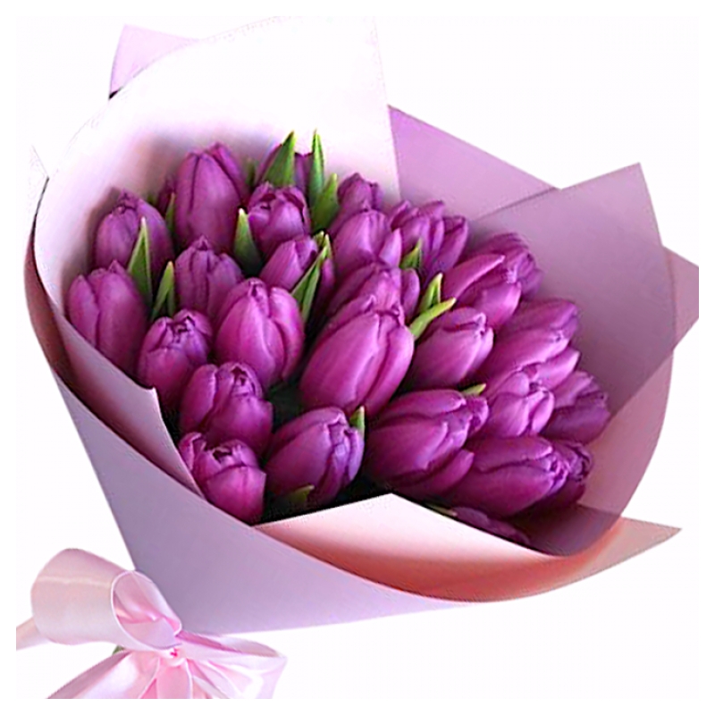 Букет состоит из 25 сиреневых тюльпанов, красивая упаковка, атласная лента.