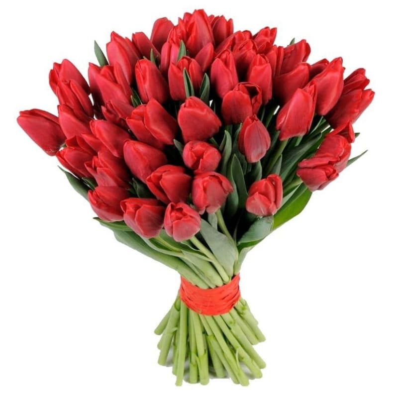 Букет состоит из 35 красных тюльпанов, прозрачная упаковка, атласная лента.