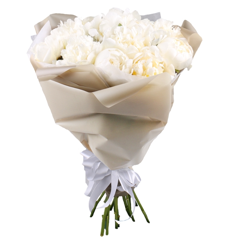 Букет состоит из 17 белых пионов, крафт, атласная лента.