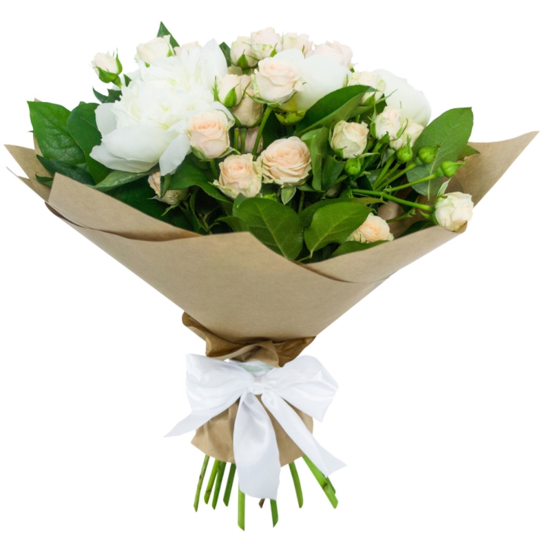 Букет состоит из 5 белых пионов, 4 ветки кремовой кустовой розы, салал, крафт, атласная лента.