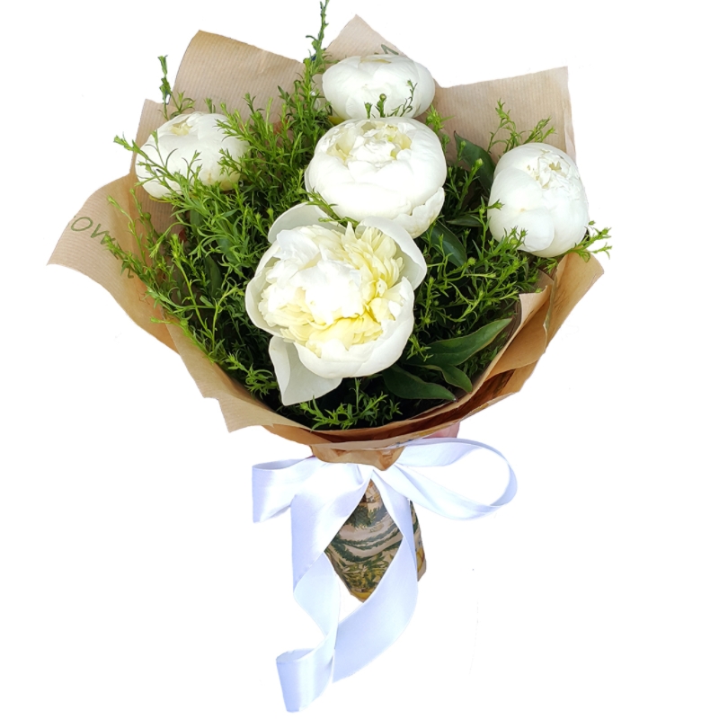 Букет состоит из 5 белых пионов, зелень, крафт, атласная лента.