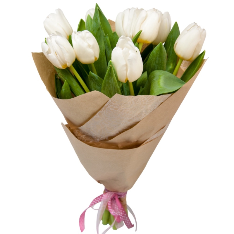 Букет состоит из 9 белых тюльпанов, крафт, атласная лента.