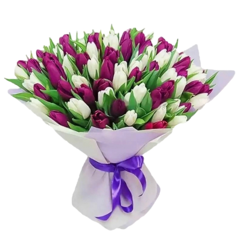Букет состоит из 51 сиреневых тюльпанов, 50 белых тюльпанов, красивая упаковка, атласная лента.