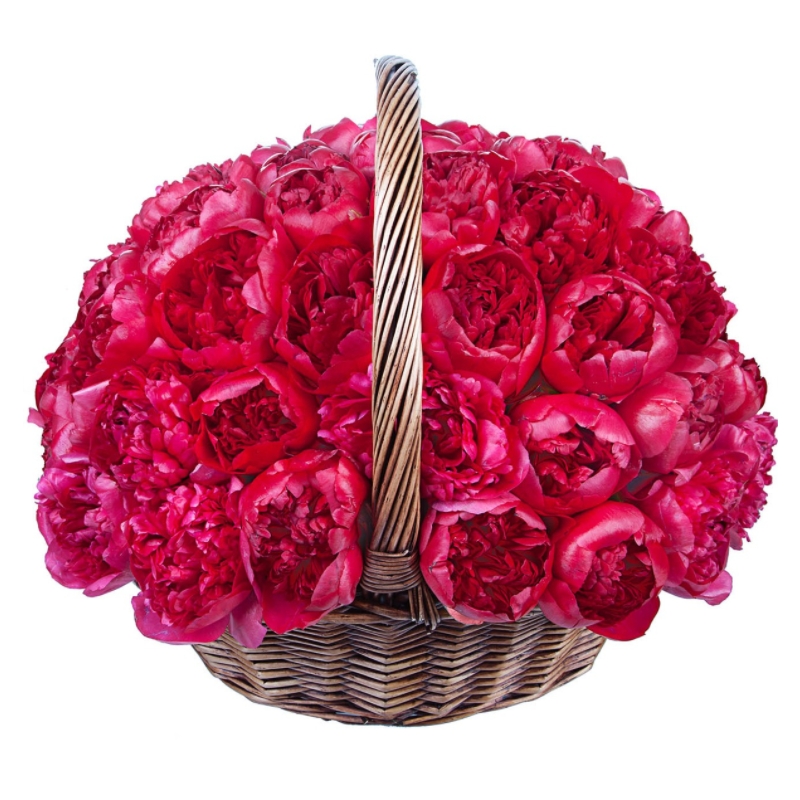 Букет состоит из 45 красных пионов, корзина, оазис.