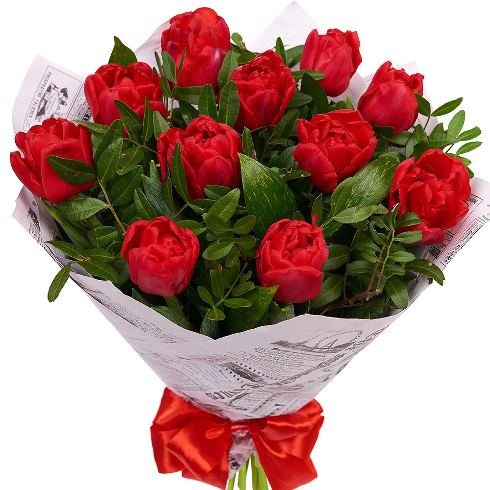 Букет состоит из 11 красных тюльпанов, зелень, крафт.