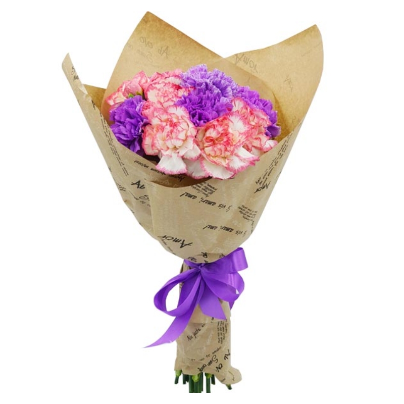 Букет состоит из 5 розовых гвоздик, 4 сиреневые гвоздики, крафт, атласная лента.