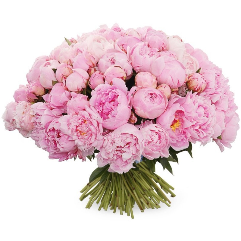 Букет состоит из 101 розовый пион, прозрачная упаковка, розовая лента.