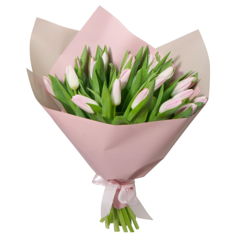 Букет состоит из 15 розовых тюльпанов, красивая упаковка, атласная лента.