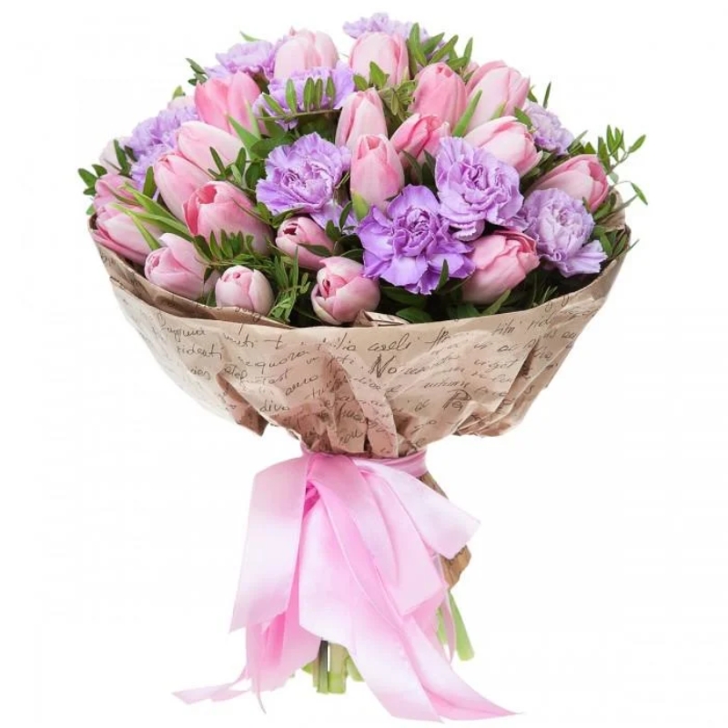 Букет состоит из 30 розовых тюльпанов, 13 сиреневых гвоздик, зелень, крафт, атласная лента.