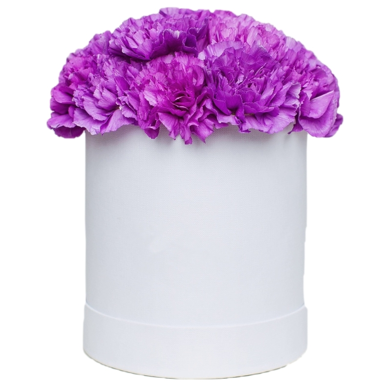 Букет состоит из 21 сиреневая гвоздика, коробка, оазис.