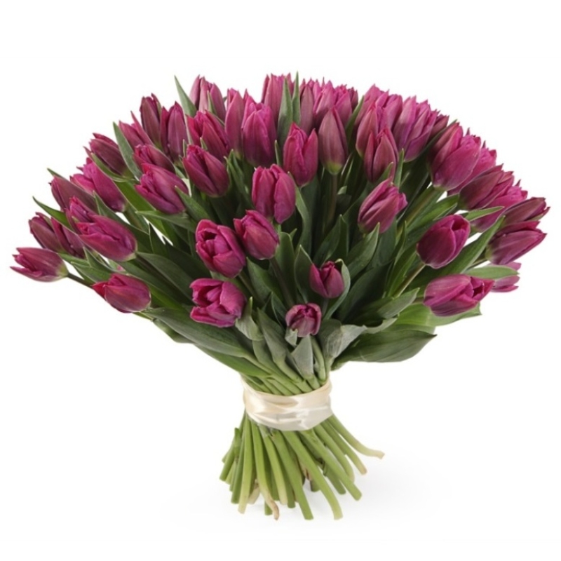 Букет состоит из 101 сиреневый тюльпан, прозрачная упаковка, атласная лента.