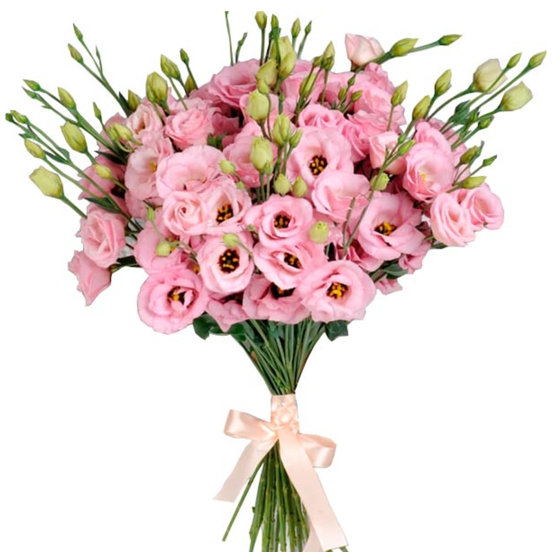 Букет состоит из 19 веток розовой эустомы, прозрачная упаковка, атласная лента.