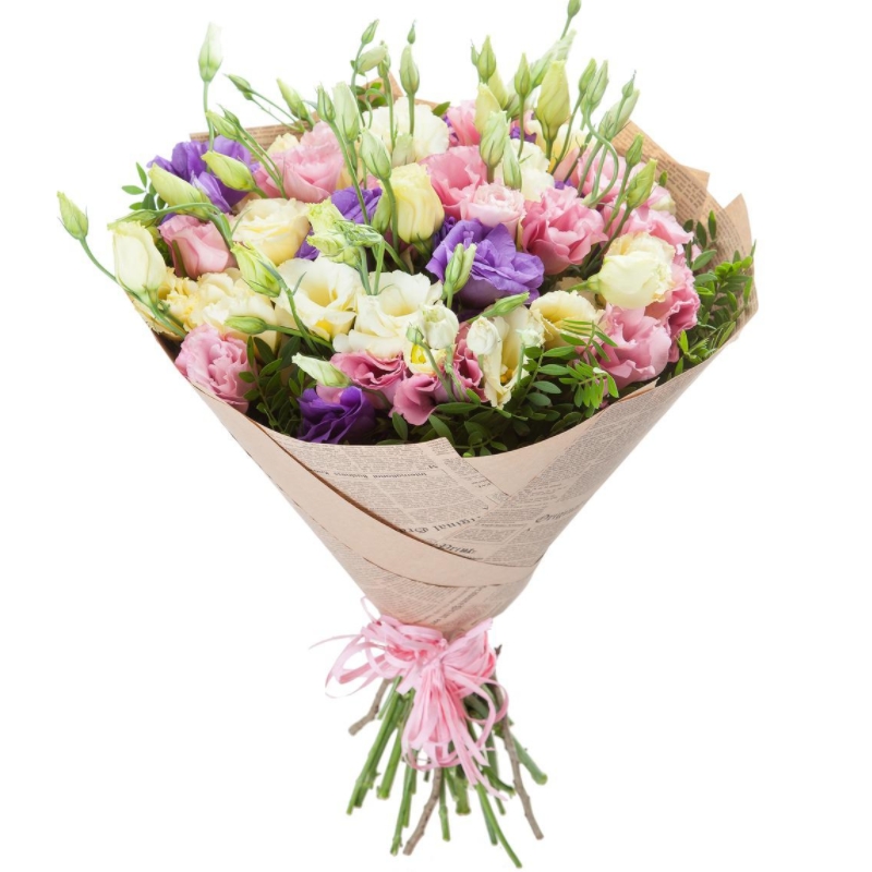 Букет состоит из MIX из 17 веток эустомы, зелень, крафт, атласная лента.
