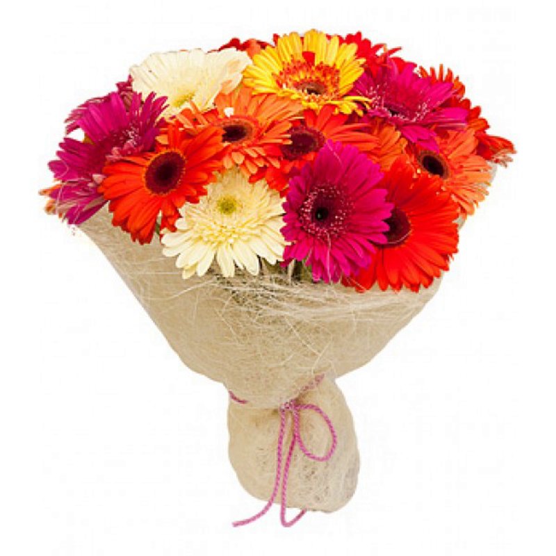 Букет состоит из MIX из 25 гербер, фетр, красная лента.