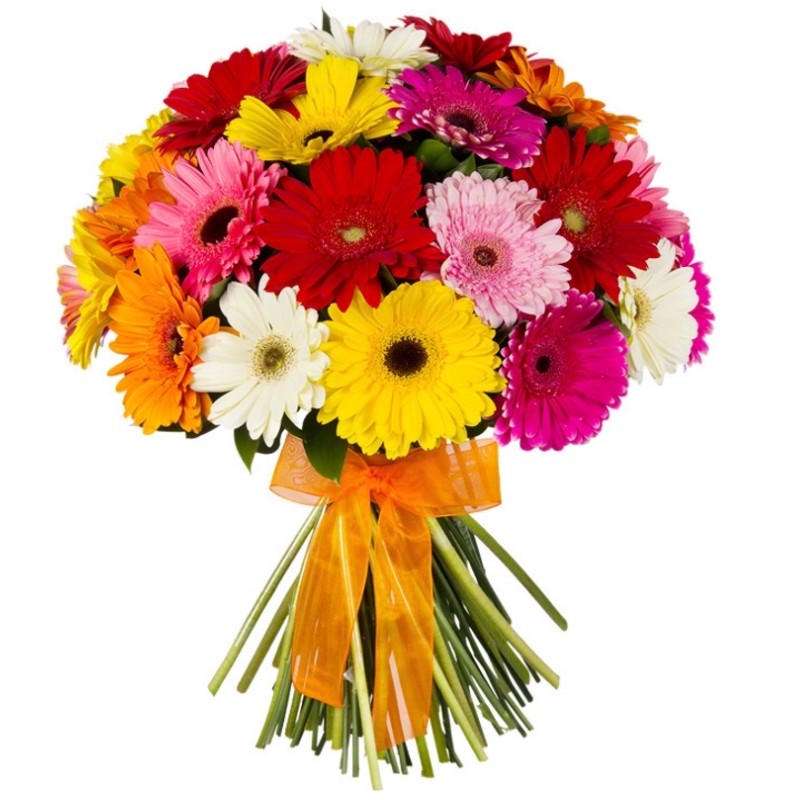 Букет состоит из MIX из 31 гербера, прозрачная упаковка, атласная лента.