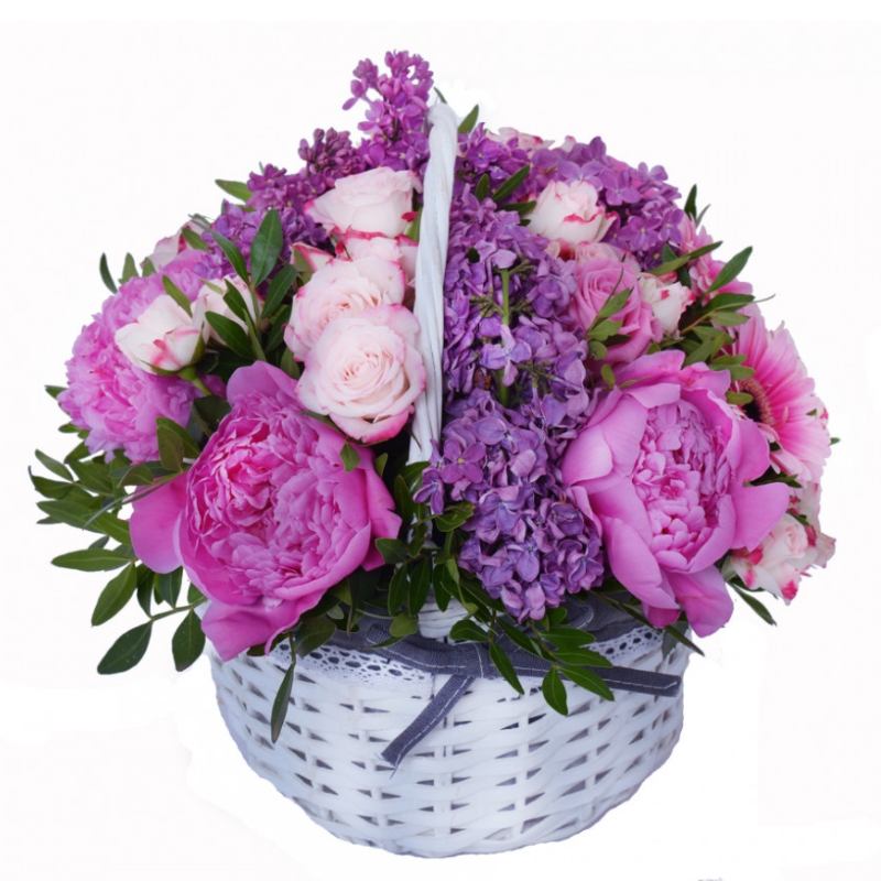 Букет состоит из 5 пионов, 2 герберы, 4 ветки кустовой розы, 1 роза, 1 ветка сирени, зелень, корзина, оазис.