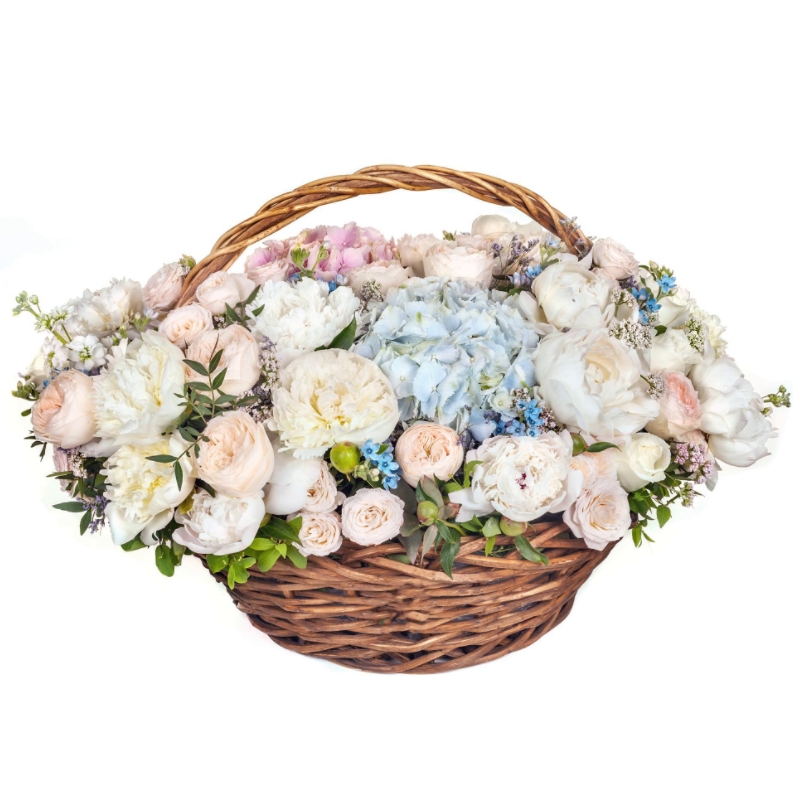 Букет состоит из 15 пионов, 2 гортензии, 8 веток пионовидных кустовых роз, 5 гиперикум, 7 озотамнус, зелень, корзина, оазис.