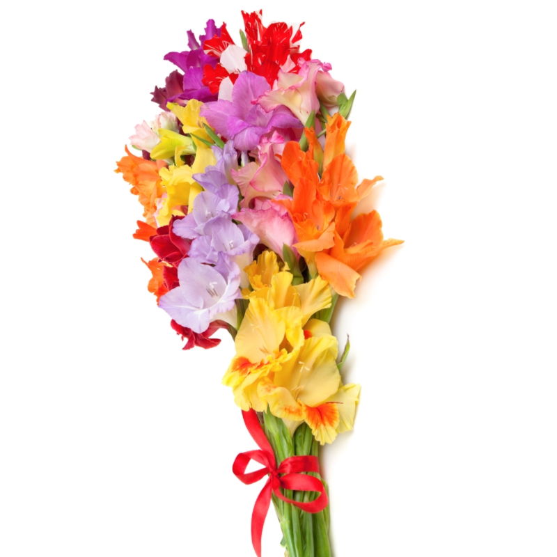 Букет состоит из MIX из 9 гладиолусов, прозрачная упаковка, атласная лента.