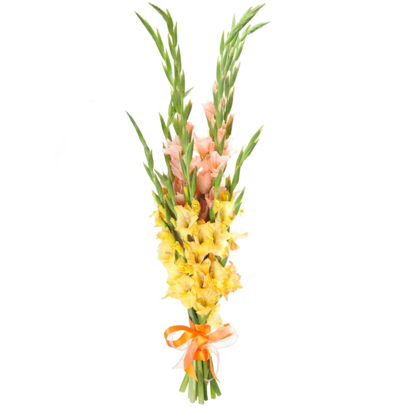 Букет состоит из MIX из 11 гладиолусов, прозрачная упаковка, атласная лента.