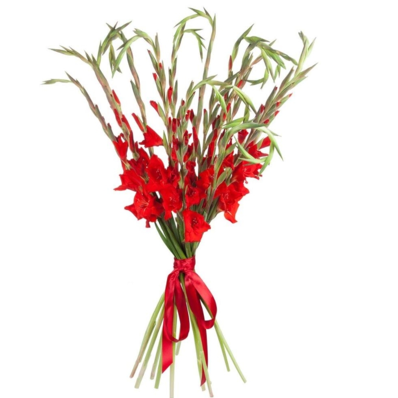 Букет состоит из 11 красных гладиолусов, прозрачная упаковка, атласная лента.