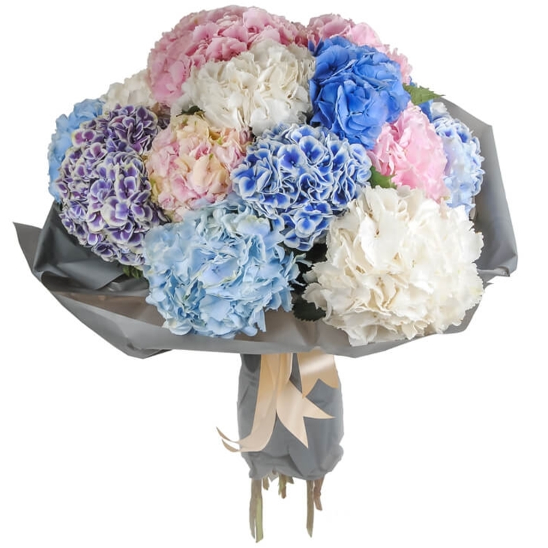 Букет состоит из 15 разноцветных гортензий, красивая упаковка, атласная лента.