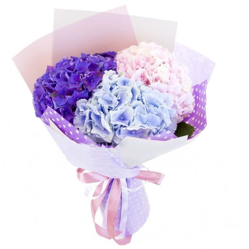 Букет состоит из 3 разноцветные гортензии, красивая упаковка, атласная лента.
