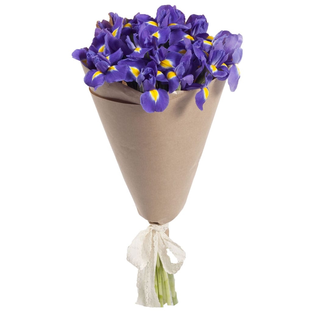 Букет состоит из 15 ирисов, крафт, атласная лента.