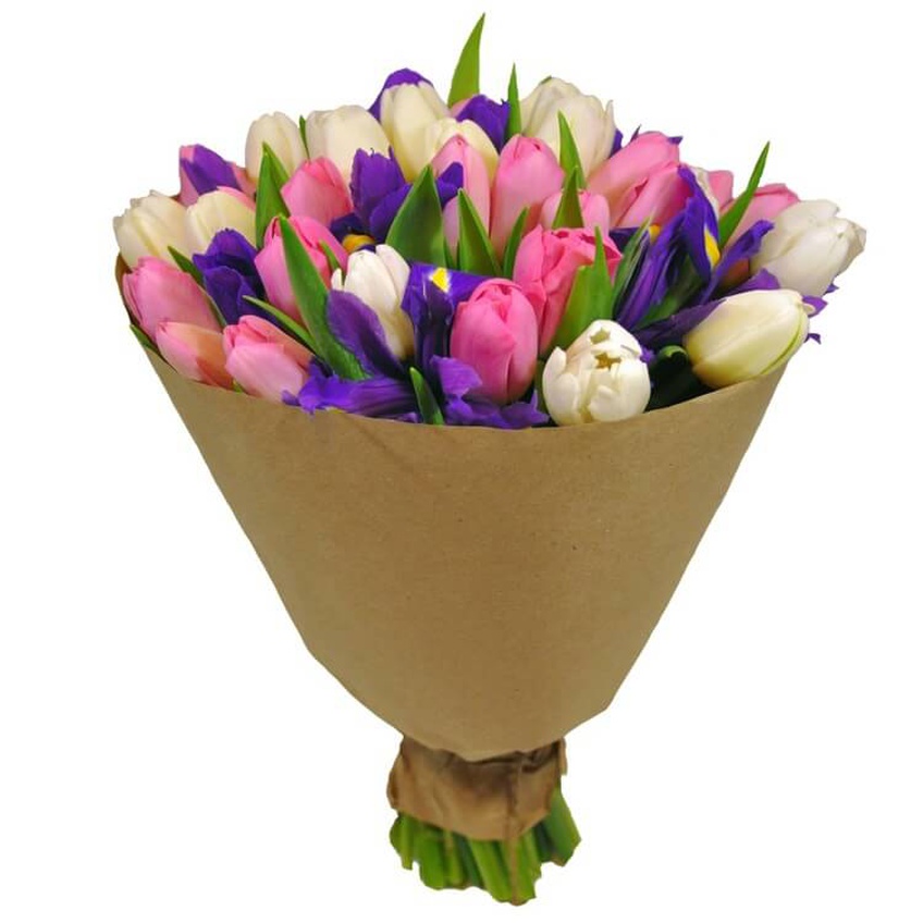 Букет состоит из 25 белых и розовых тюльпанов, 10 ирисов, зелень, крафт, атласная лента.