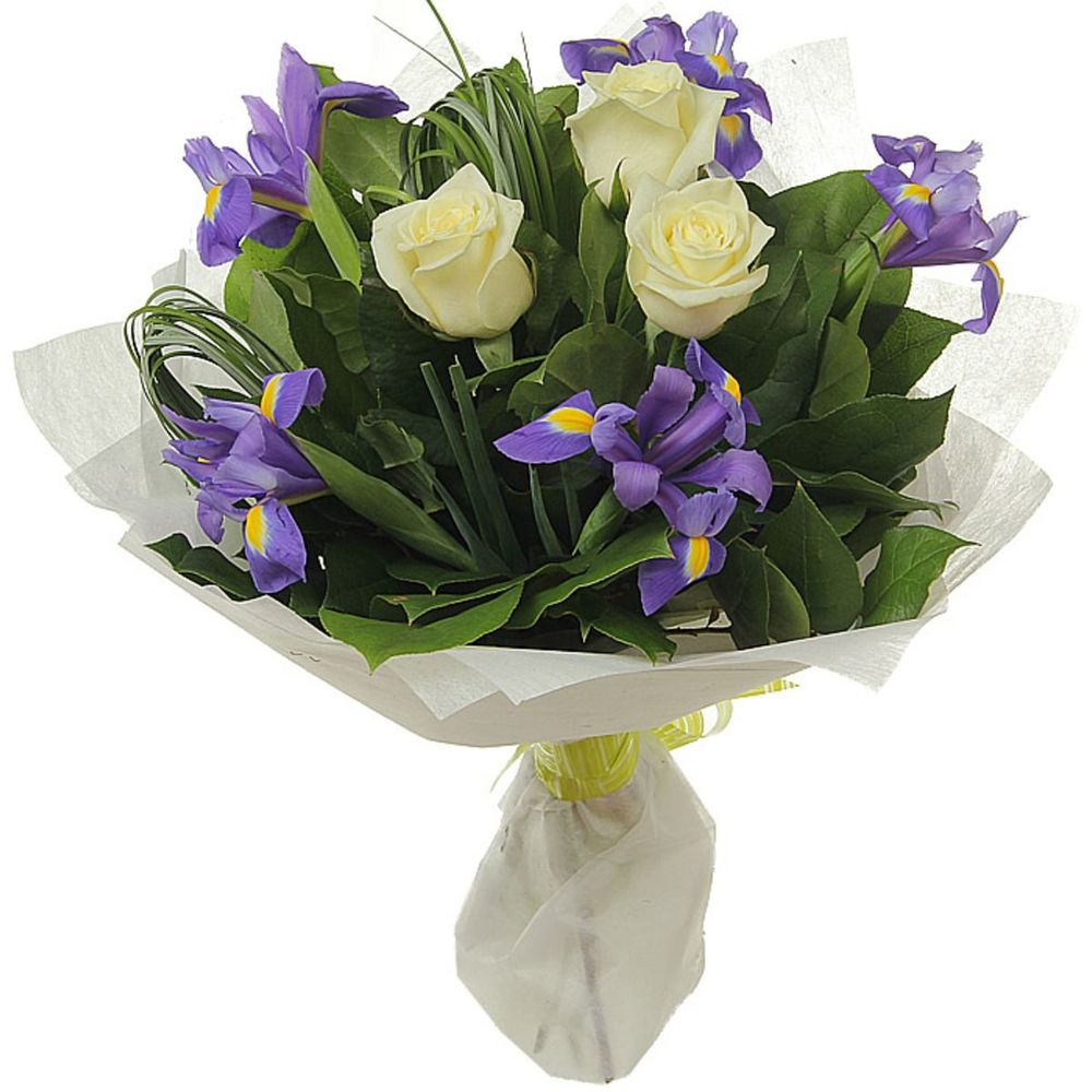 Букет состоит из 3 белые розы, 5 ирисов, зелень, красивая упаковка, атласная лента.