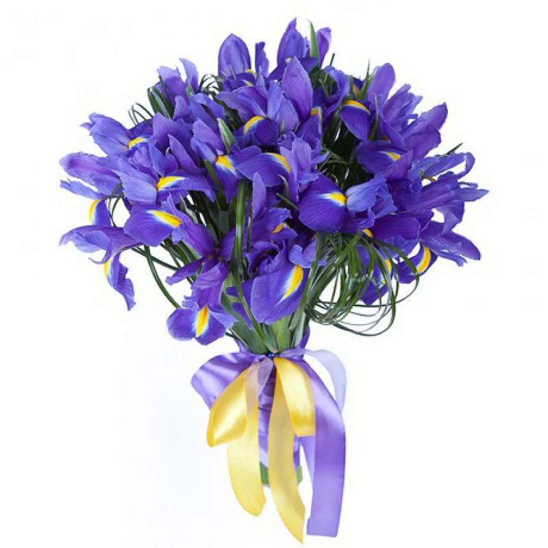 Букет состоит из 29 ирисов, прозрачная упаковка, атласная лента.