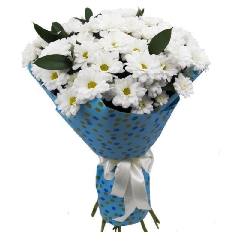 Букет состоит из 7 веток белых хризантем, зелень, красивая упаковка.