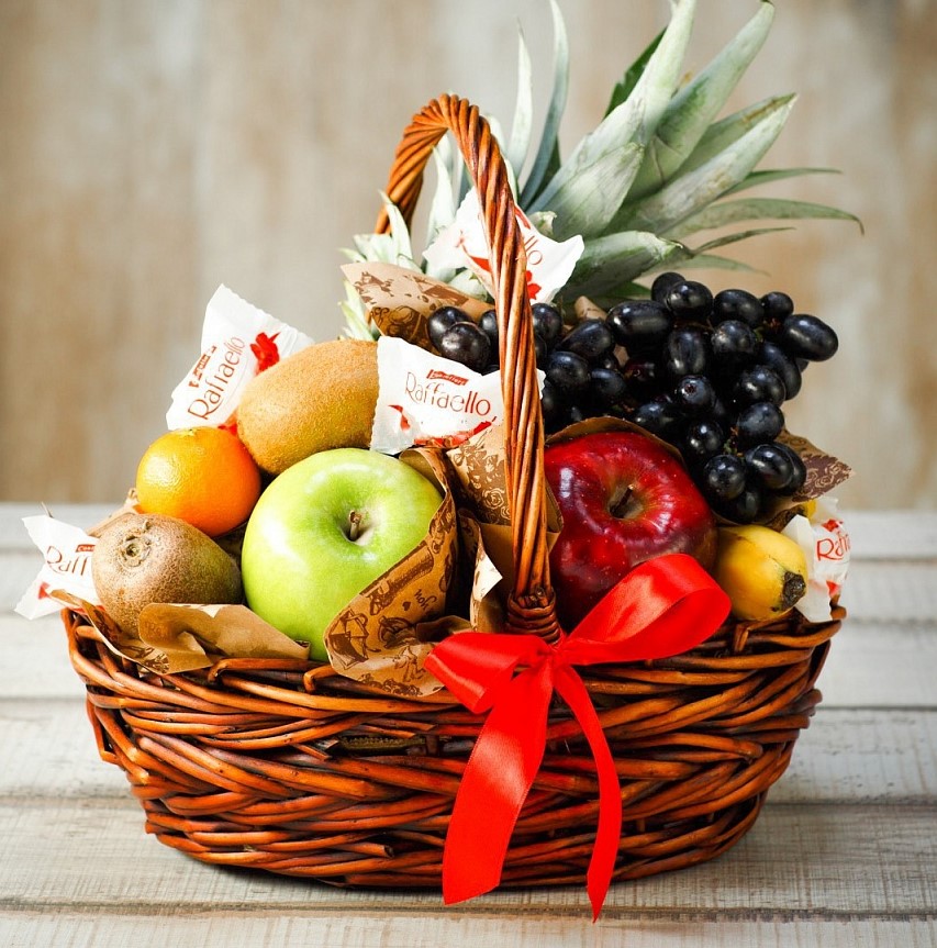 фруктовая композиция в корзине из винограда, бананов, яблок, мандарин, ананаса и конфет раффаэлло. 3,5 кг.