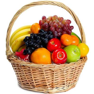 В корзине: бананы, гроздь винограда, апельсин 2 шт., яблоки 7 шт., гранат, мандарин 5 шт., лимон 1 шт.