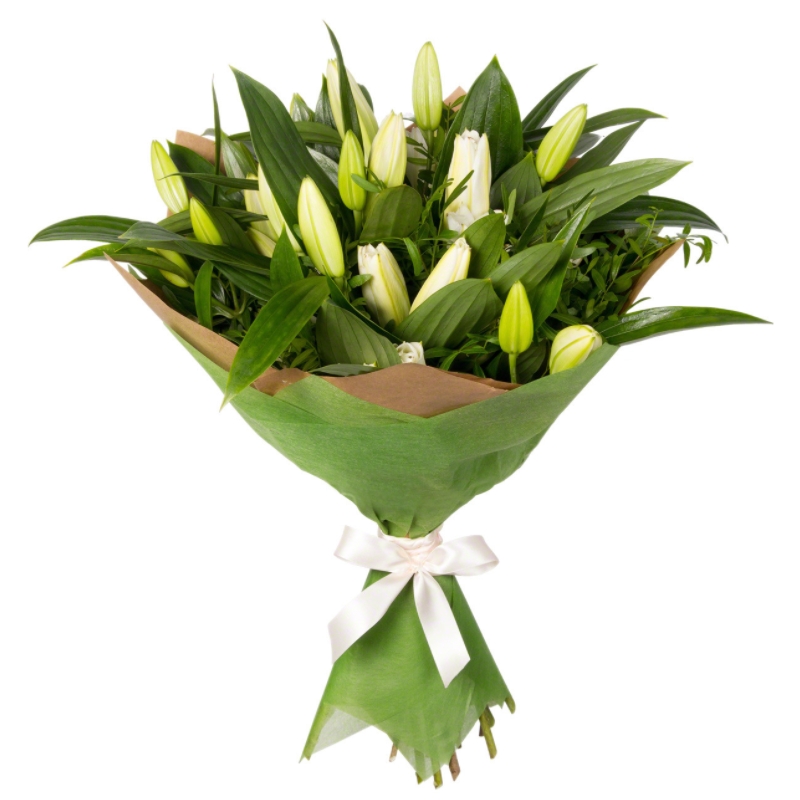 Букет состоит из 9 веток белой лилии, зелень, крафт, фетр, атласная лента.