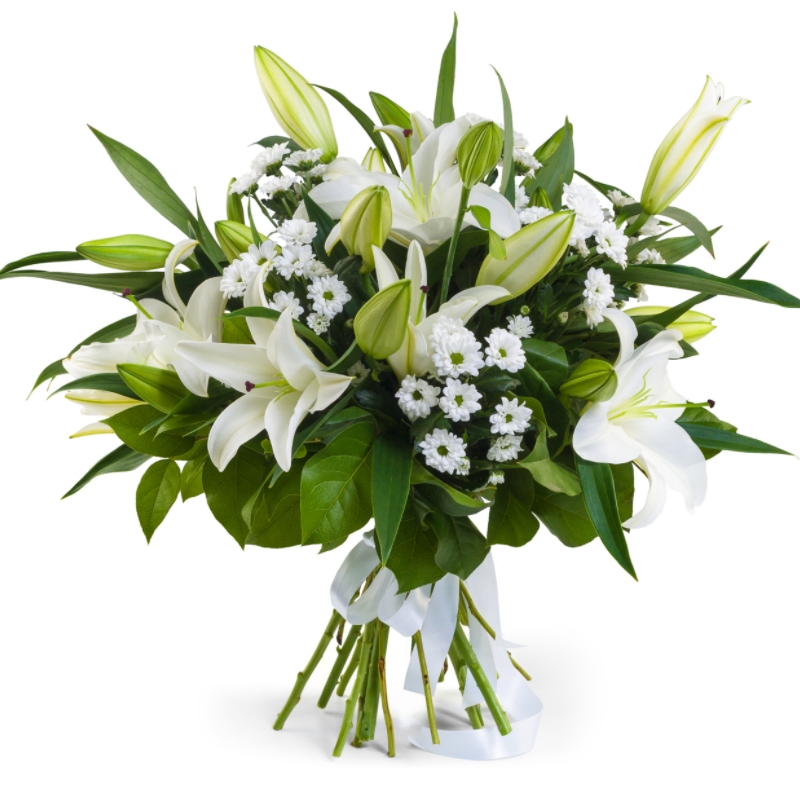 Букет состоит из 5 белых лилий, 6 хризантем Сантини, салал, прозрачная упаковка, атласная лента.