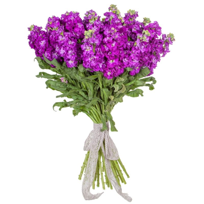 Букет состоит из 21 фиолетовая маттиола, прозрачная упаковка, атласная лента.