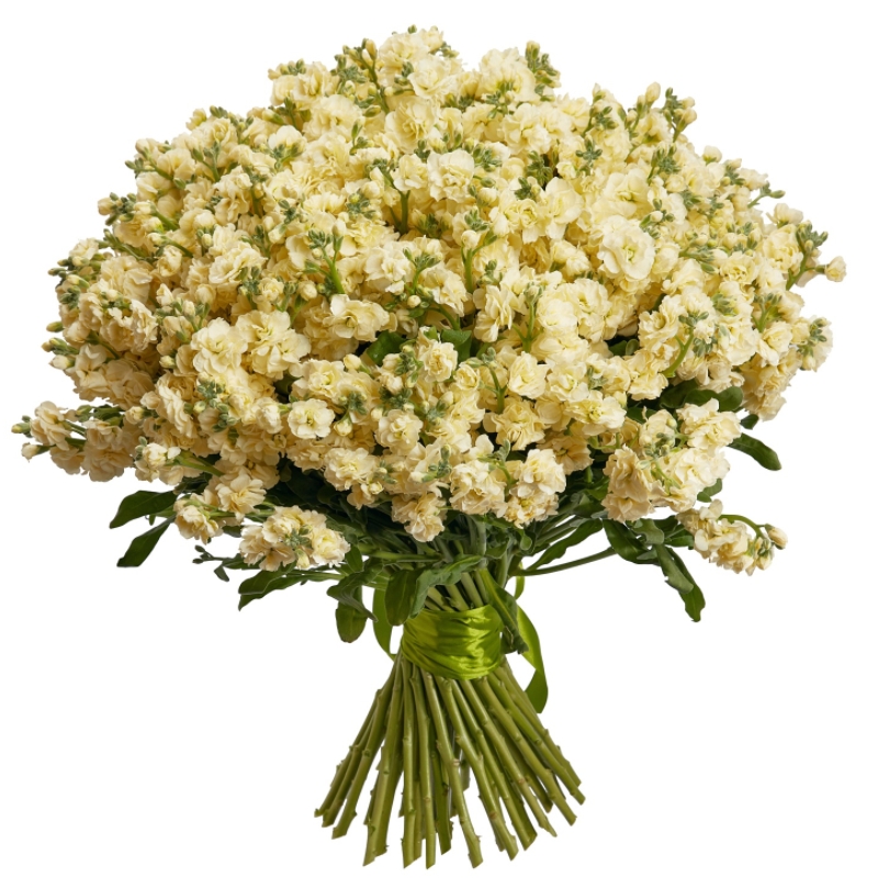 Букет состоит из 45 кремовых маттиол, прозрачная упаковка, атласная лента.
