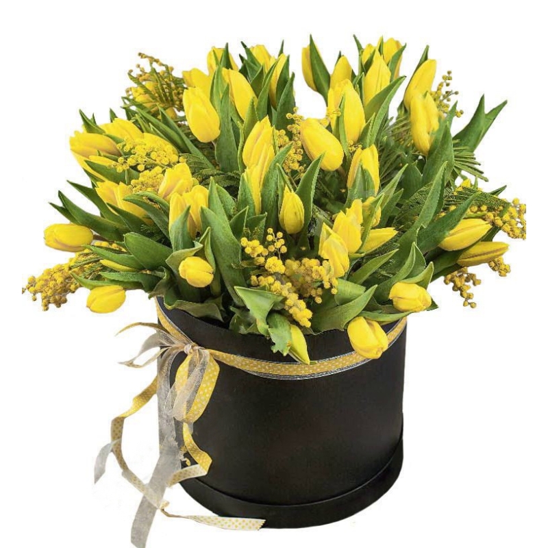 Букет состоит из 45 желтых тюльпанов, 6 веток мимозы, коробка, оазис.