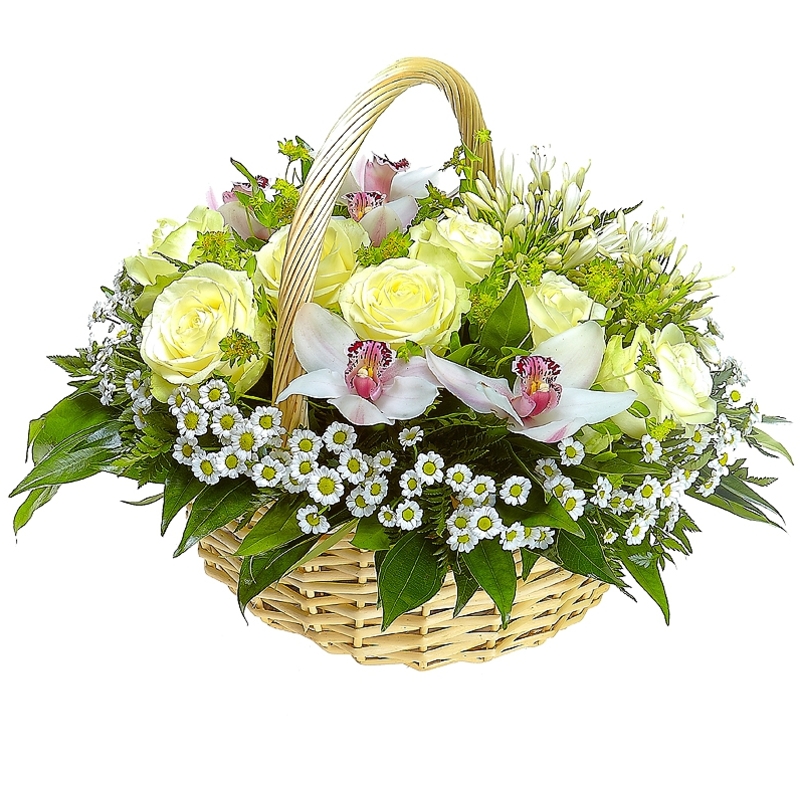 Букет состоит из 7 белых роз, 5 орхидей, 6 веток хризантем Сантини, 3 агапантуса, зелень, корзина, оазис.