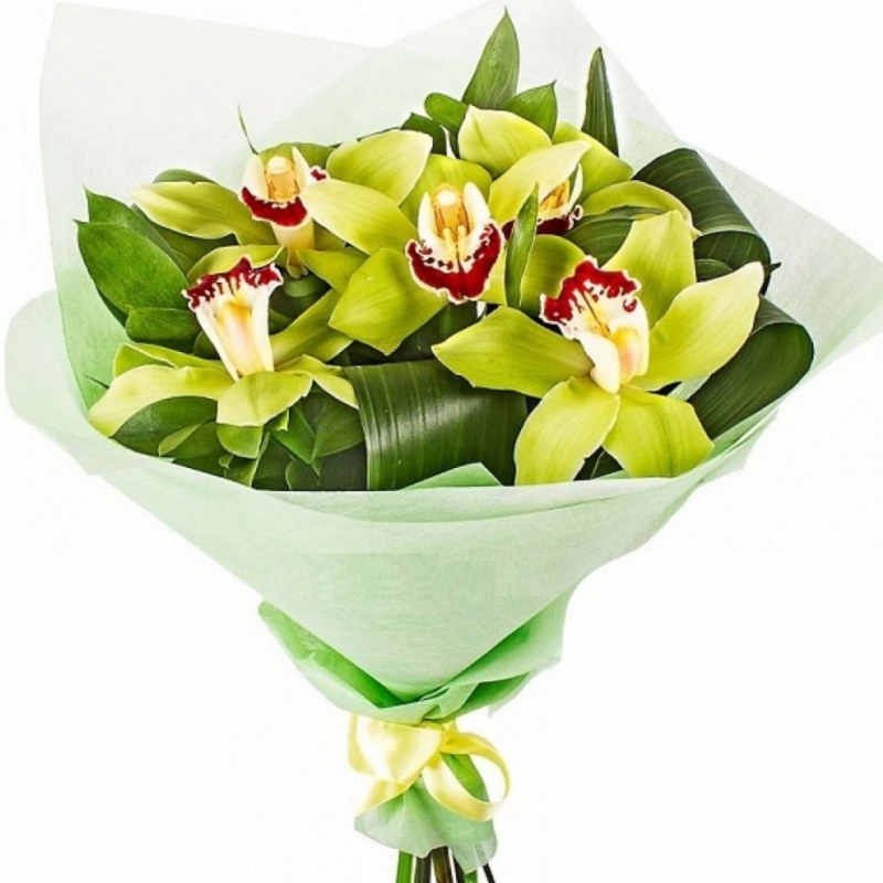 Букет состоит из 5 орхидей, красивая упаковка, атласная лента.